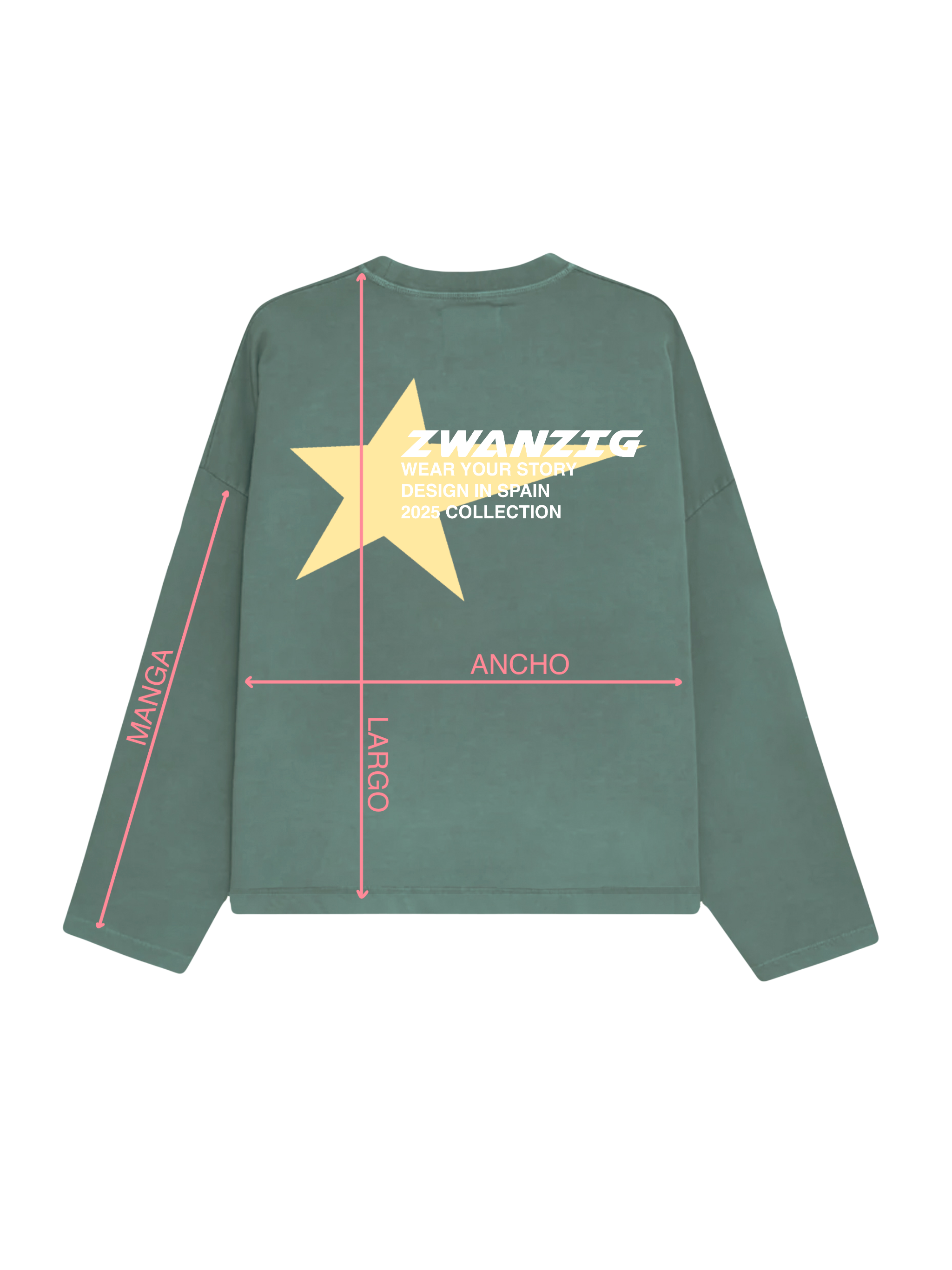 Crewneck oversize en verde desgastado. Gráfico en amarillo y blanco en la parte trasera, con una estrella como elemento central y el texto “ZWANZIG – Wear Your Story – Design in Spain – 2025 Collection”.